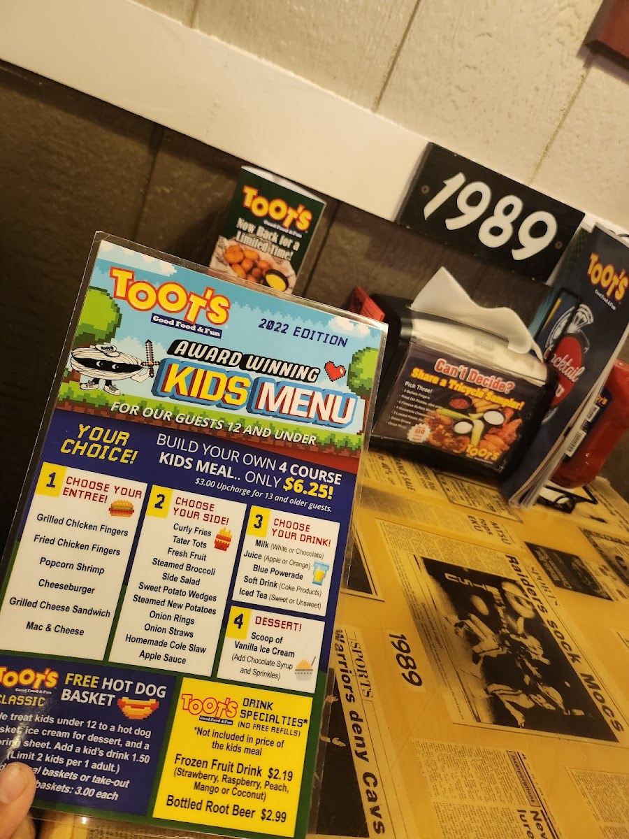 Kid's portion of golden popcorn shrimp, hushpuppies, cocktail or Cherry Mustard, your choice of side, and a lemon wedge.