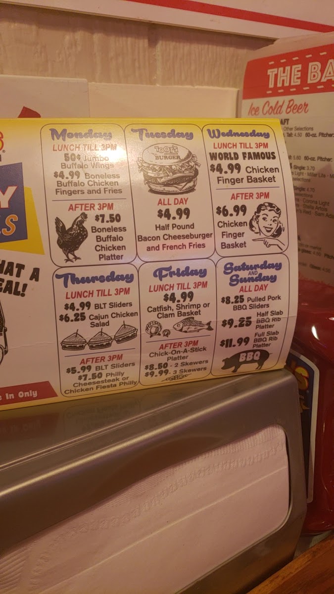 Thick bacon slices, your choice of cheese. Served with lettuce, tomato, onion, and pickle. With your choice of side.